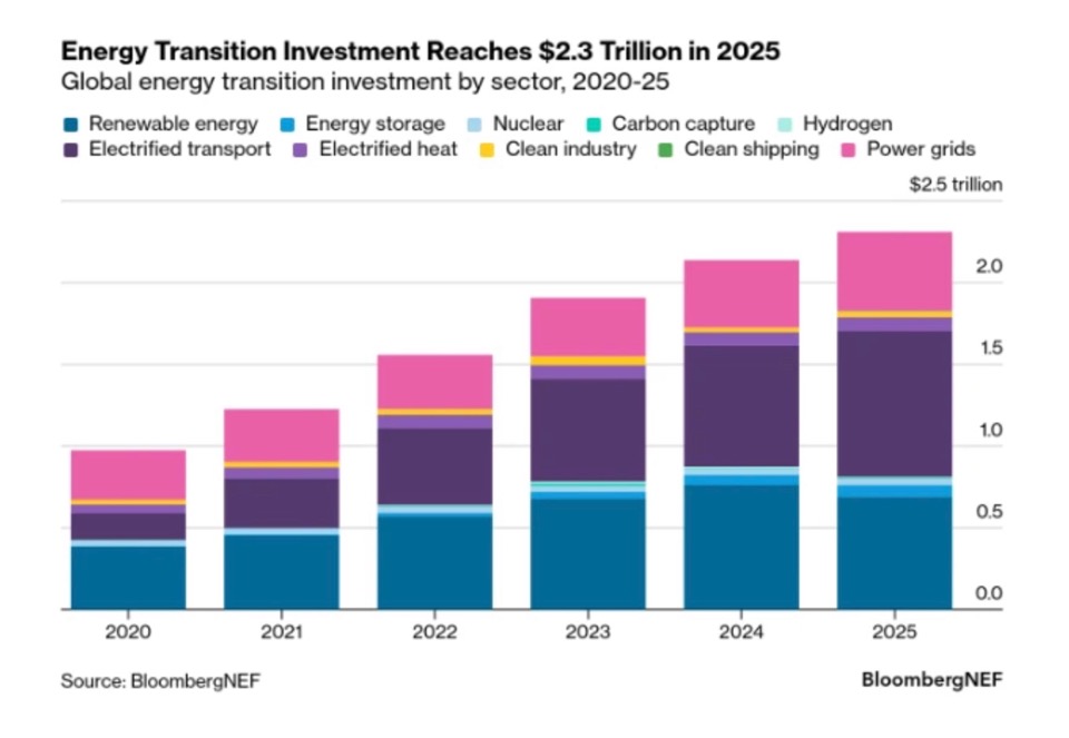 Согласно новому отчету, мировые инвестиции в «низкоуглеродный энергетический переход» в 2025 году достигли рекордных 2,3 триллиона долларов, что на 8% больше, чем в 2024.